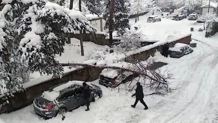 Bingöl'de etkisini gösteren kar nedeniyle ağırlığa dayanamayan bir ağaç, park halindeki aracın üstüne devrildi.