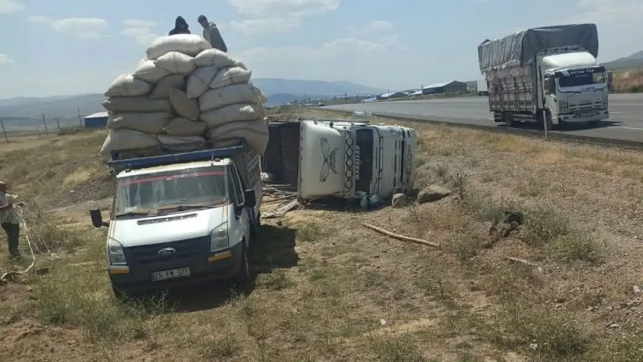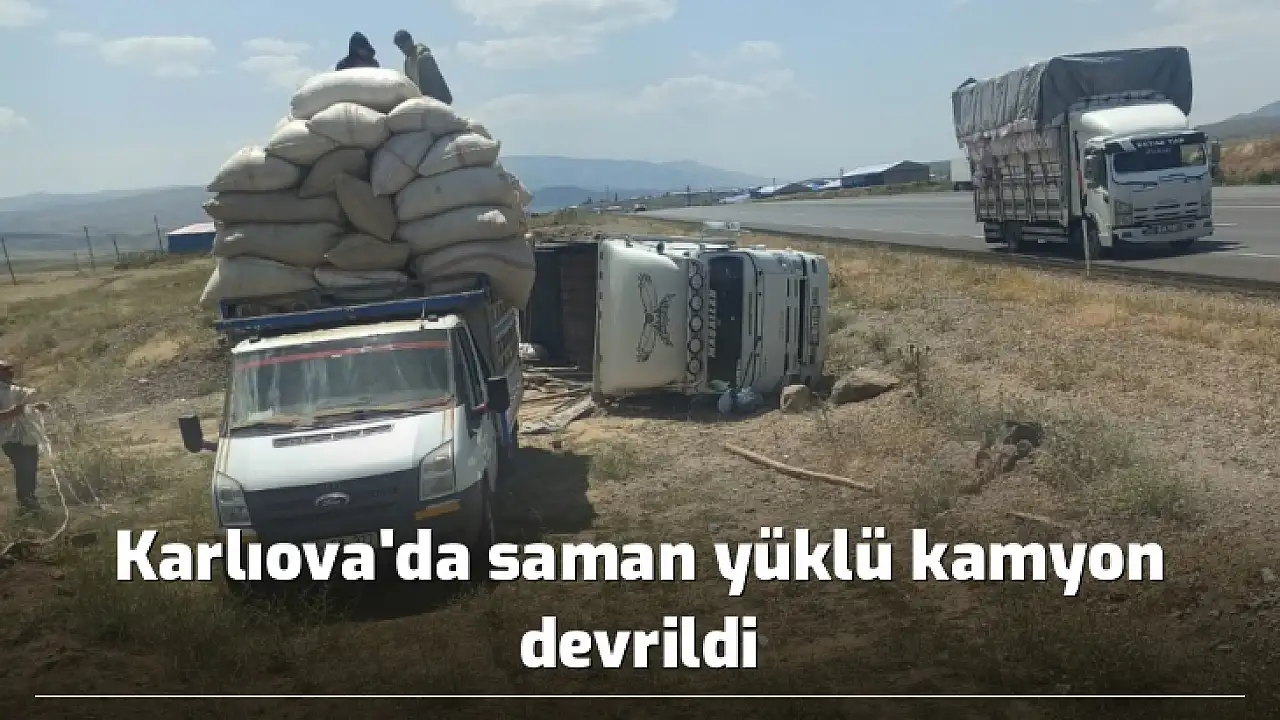 Bingöl'ün Karlıova ilçesinde saman yüklü kamyon devrildi, kazada yaralanan olmadı.
