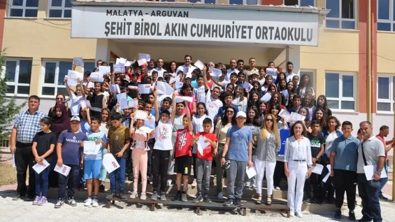 Malatya'nın Arguvan ilçesinde Şehit Birol Akın Cumhuriyet Ortaokulunda karne töreni ile birlikte okula adı verilen Şehit Astsubay Birol Akın da unutulmadı.