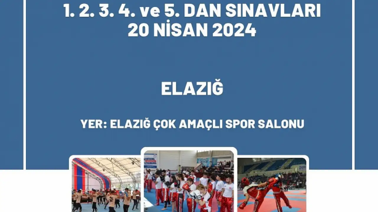 Türkiye Kick Boks Federasyonu siyah kuşak 1. 2. 3. 4. ve 5. dan sınavları Elazığ’da düzenlenecek. 20 Nisan 2024 tarihinde yapılacak olan sınavlara yerel ve ulusal çapta bir çok sporcu ve antrenörün katılım sağlaması bekleniyor. Organizasyona Elazığ GSİM Çok Amaçlı Spor Salonu ev sahipliği yapacak.