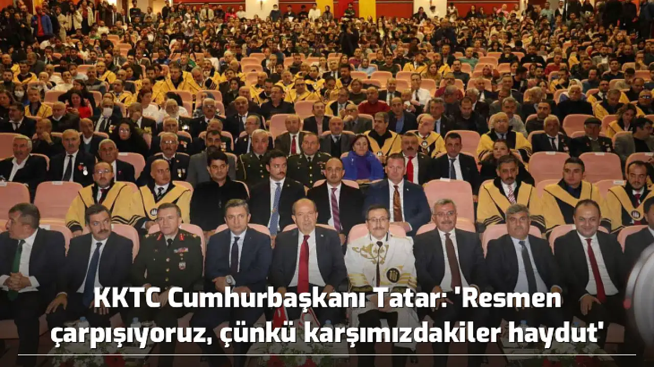 Şuanda Kuzey Kıbrıs Türk Cumhuriyeti üniversitelerinde 144 farklı ülkeden öğrencinin eğitim gördüğünü ve bu durumunda aslında bir nevi bütün bu ülkelerin Kuzey Kıbrıs Türk Cumhuriyeti’nin varlığını kabul ettiği anlamına geldiğini ifade eden Tatar, “Yüzlerde farklı ülkelerden turistler gelip gidiyorlar. Dünyanın farklı ülkelerinde ticari ilişkilerimiz var, giderek kökleşmekteyiz. Siyasetimizi sağlam temeller üzerinde geliştirmeye çalışan bir zihniyetle bunlarla çarpışıyoruz. Resmen çarpışıyoruz, çünkü karşımızdakiler haydut. O şekilde bir anlayışla Kıbrıslı Türklerin haklarını hukukunu yok etmek için her türlü planla programla sinsi oyunlarla bize bu yanlışları yaparak bizleri pes ettireceklerini sananlar karşılarında işte böyle bir mücadele veren bir anlayış görüyorlar.” diye konuştu.