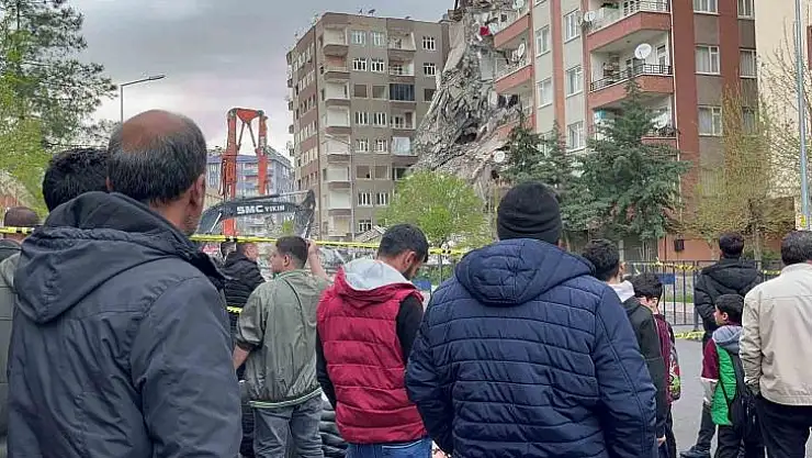 Diyarbakır'da ağır hasarlı 7 katlı bina yıkıldı, yıkımı mahalle kenarında bekleyip film izler gibi izleyen halk dikkat çekti.