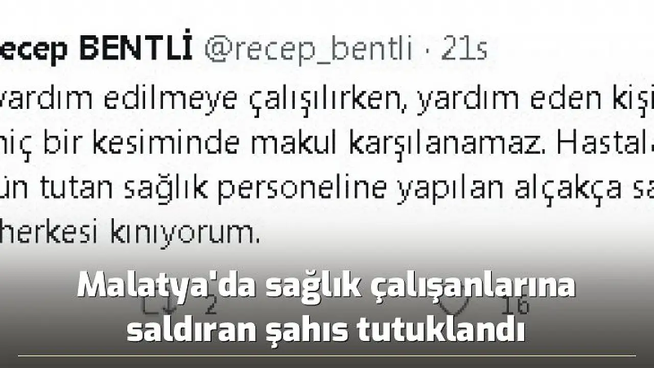 Bu arada, Malatya İl Sağlık Müdürü Prof. Dr. Recep Bentli de sosyal medyasında yaptığı açıklamada, saldırıyı kınayıp, “Kendisine yardım edilmeye çalışılırken, yardım eden kişiye şiddet uygulamak toplumun hiç bir kesiminde makul karşılanamaz. Hastalarımızın sağlığını her şeyden üstün tutan sağlık personeline yapılan alçakça saldırıyı ve şiddet uygulayan herkesi kınıyorum. Sağlık personelimize geçmiş olsun dileklerimi sunuyor; sağlıkta şiddetin sona ermesini temenni ediyorum“ ifadelerine yer verdi.