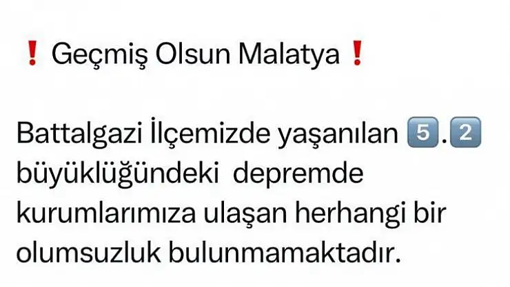 Saat 16.04’de merkez üssü Malatya’nın Battalgazi ilçesinde meydana gelen 5.2 büyüklüğündeki deprem paniğe neden oldu. Malatya Valisi Ersin Yazıcı, sosyal medya hesabından yaptığı açıklamada, kentte meydana gelen depremde herhangi bir olumsuz duruma rastlanmadığını belirtti. Vali Yazıcı, “Battalgazi ilçemizde yaşanılan 5.2 büyüklüğündeki depremde kurumlarımıza ulaşan herhangi bir olumsuz durum bulunmamaktadır. Hemşehrilerimize geçmiş olsun” dedi.