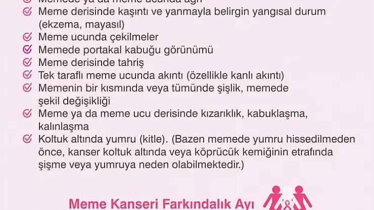 Kadınların korkulu rüyası olan meme kanserinin belirtileri konusunda yapılan açıklamada ise kitlenin önemine dikkat çekilip, “Meme kanserinin en sık rastlanan belirtisi, memede ağrısız, zamanla büyüyen bir yumrunun (kitlenin) ele gelmesi, hissedilmesidir. Ayrıca ele gelen yumru (kitle) olsa da olmasa da aşağıdaki belirtiler de meme kanserinde görülebilmektedir. Memede ya da meme ucunda ağrı, Meme derisinde kaşıntı ve yanmayla belirgin yangısal durum (ekzema, mayasıl), meme ucunda çekilmeler, Memede portakal kabuğu görünümü, Meme derisinde tahriş, Tek taraflı meme ucunda akıntı- özellikle kanlı akıntı, Koltuk altında yumru (kitle), Memenin bir kısmında veya tümünde şişlik, memede şekil değişikliği, Meme ya da meme ucu derisinde kızarıklık, kabuklaşma, kalınlaşma şeklinde ortaya çıkar” denilerek, bunlara karşı dikkatli olunması istendi.