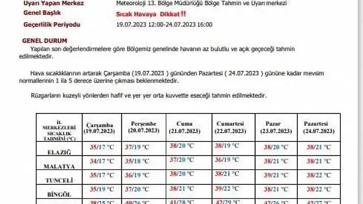 Meteoroloji 13. Bölge Müdürlüğü Bölge Tahmin ve Uyarı Merkezi, Elazığ'da 19-24 Temmuz arasında sıcaklıkların 1 ila 5 derece arasında artacağının beklendiğini açıklayarak vatandaşları uyardı.