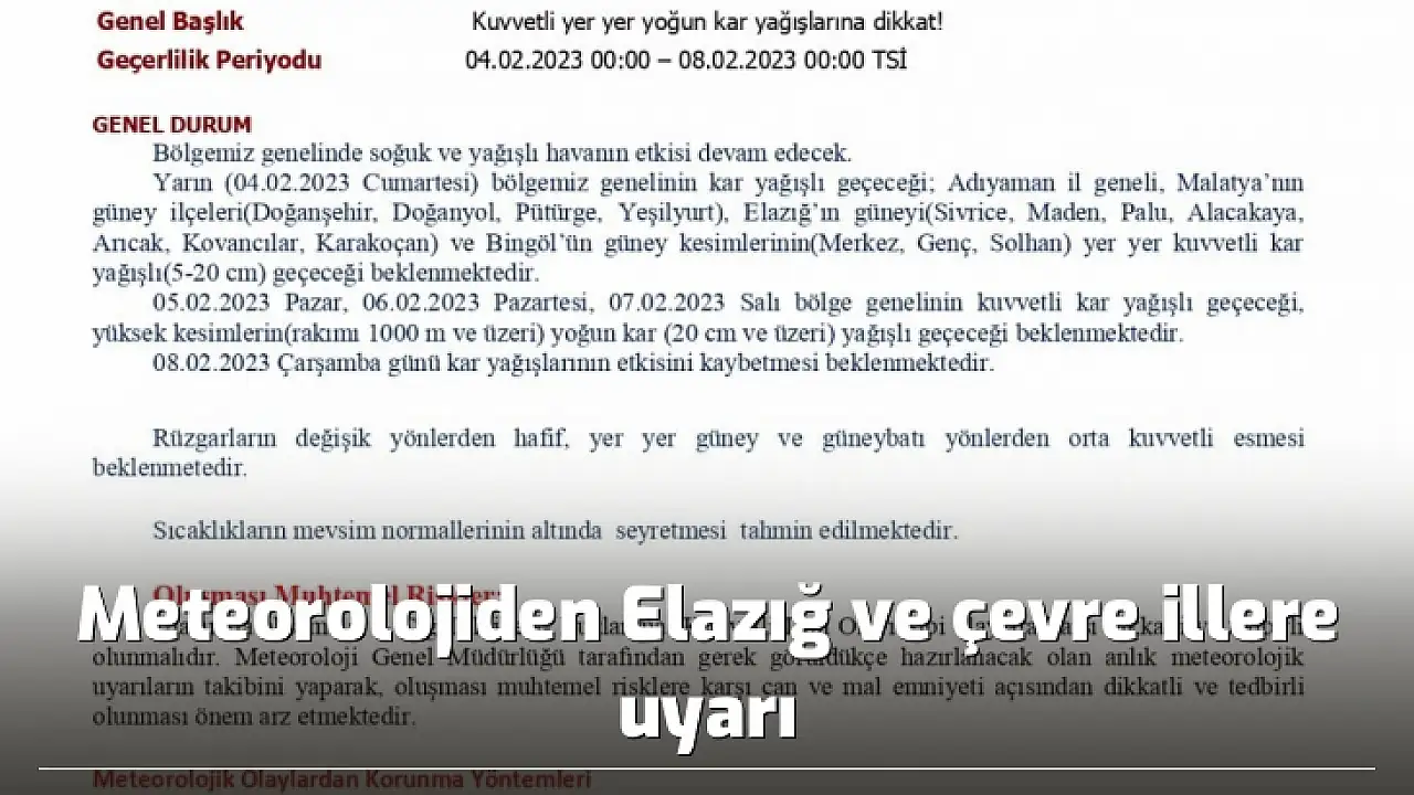 Meteoroloji 13. Bölge Müdürlüğü tarafından Elazığ, Malatya ve Bingöl illeri için yoğun kar yağışı uyarısı yapıldı. Meteoroloji Bölge Müdürlüğünden yapılan açıklamada, pazar gününden itibaren kuvvetli kar yağışının etkili olacağı ifade edildi. Meteoroloji 13. Bölge Müdürlüğü tarafından yapılan açıklamada, "Bölgemiz genelinde soğuk ve yağışlı havanın etkisi devam edecek. Cumartesi, bölgemiz genelinin kar yağışlı geçeceği; Adıyaman il genelinin, Malatya’nın güney ilçelerinin ve Elazığ’ın güneyi ve Bingöl’ün güney kesimlerinin yer yer kuvvetli kar yağışlı geçeceği beklenmektedir. Pazar, Pazartesi ve Salı günü ise bölge genelinin kuvvetli kar yağışlı geçeceği, yüksek kesimlerin yoğun kar yağışlı geçeceği beklenmektedir. Çarşamba günü kar yağışlarının etkisini kaybetmesi beklenmektedir. Rüzgarların değişik yönlerden hafif, yer yer güney ve güneybatı yönlerden orta kuvvetli esmesi beklenmektedir. Sıcaklıkların mevsim normallerinin altında seyretmesi tahmin edilmektedir. Ulaşımda aksamalar, çığ tehlikesi, buzlanma ve kuvvetli don olayı gibi olaylara karşı dikkatli ve tedbirli olunmalıdır. Meteoroloji Genel Müdürlüğü tarafından gerek görüldükçe hazırlanacak olan anlık meteorolojik uyarıların takibi yapılarak, oluşması muhtemel risklere karşı can ve mal emniyeti açısından dikkatli ve tedbirli olunması önem arz etmektedir" denildi.