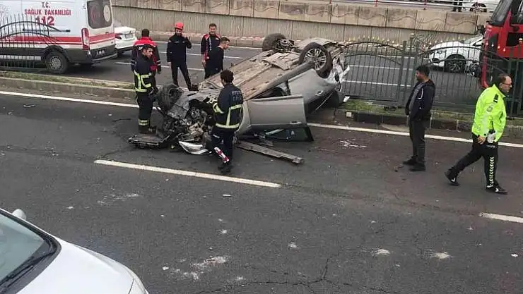 Diyarbakır'da kamyona çarpan otomobil, metrelerce takla atarak karşı şeride uçtuğu sırada refüje takıldı. Kazada 2 kişi yaralandı.