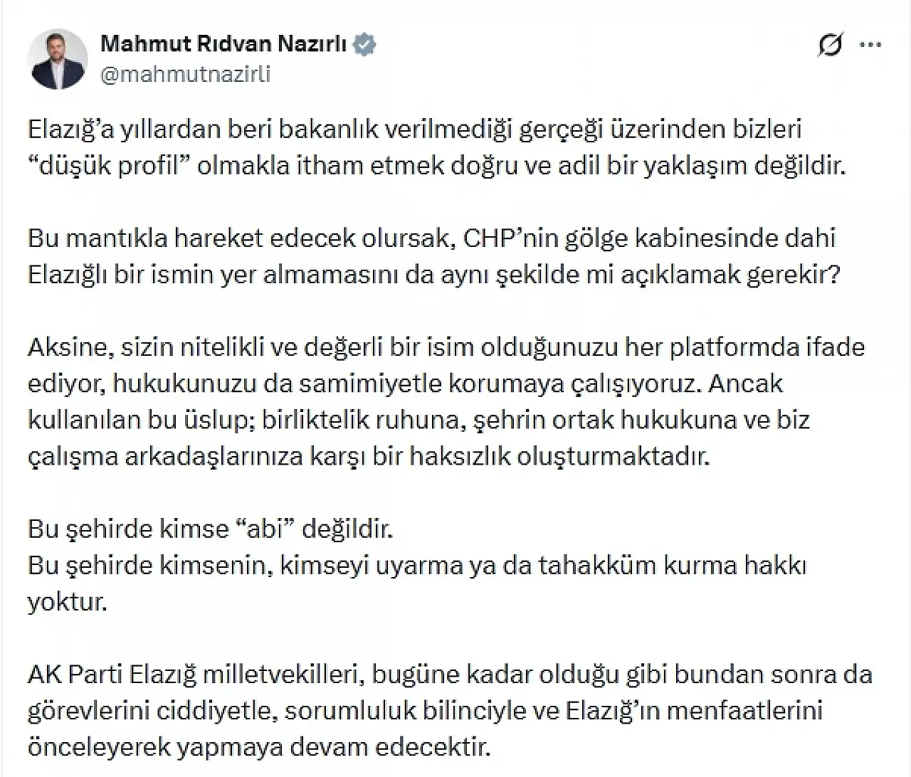 Elazığ siyasetinde tansiyon, "bakanlık" ve "siyasi ağırlık" tartışmalarıyla yükseldi. AK Parti Elazığ Milletvekili Mahmut Rıdvan Nazırlı, kendilerine yönelik bir süredir devam eden ‘düşük profil’ yaklaşımlarına karşı sessizliğini bozarak sosyal medya hesabından yazılı bir açıklama yayımladı. Açıklamanın merkezinde, eleştirilerin şehre zarar verdiği ve siyasette "abi"lik hiyerarşisinin kabul edilemeyeceği vurgusu yer aldı.