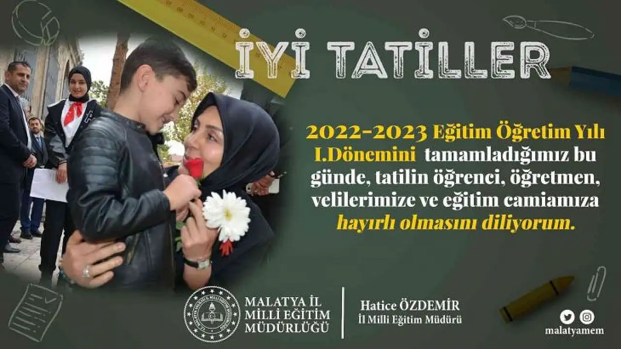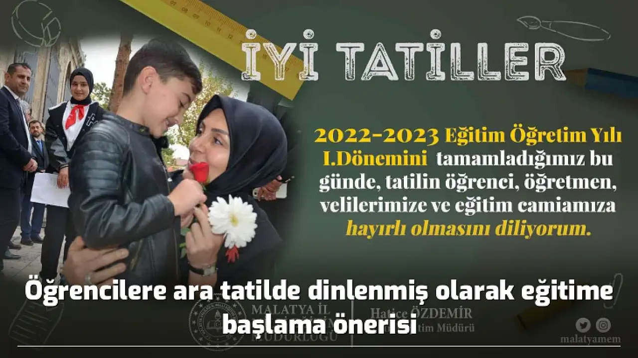 Malatya İl Milli Eğitim Müdürü Hatice Özdemir, okulların ara tatile girmesi nedeniyle öğrencilere tavsiyelerde bulunup, ara tatilde dinlenmiş ve ikinci döneme hazır olarak eğitime başlama önerisi yaptı.