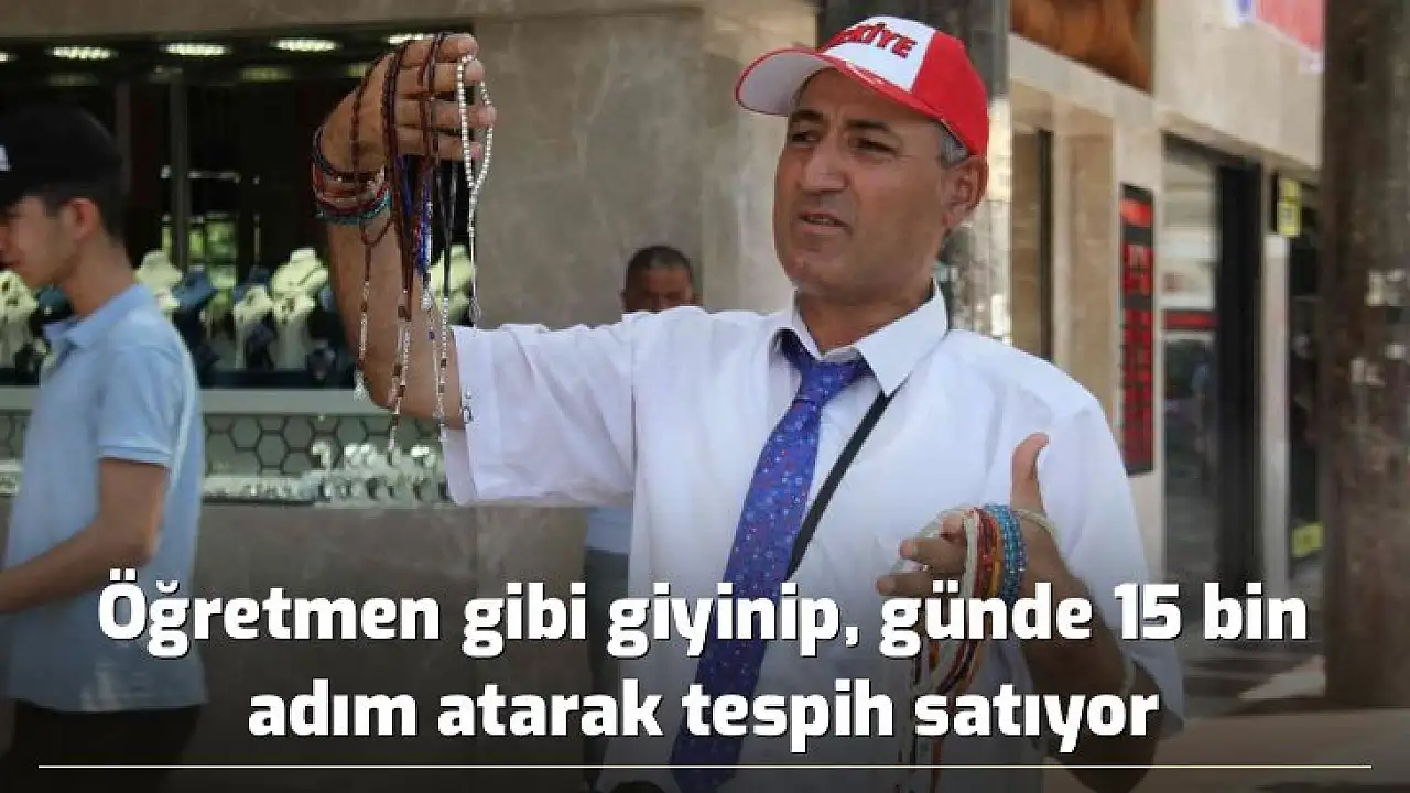 Öğretmen gibi giyinip, günde 15 bin adım atarak tespih satıyor