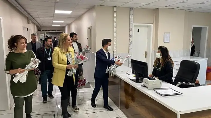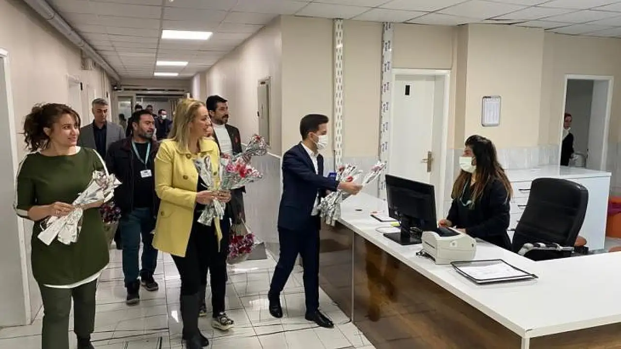 Öz Sağlık İş Sendikası Diyarbakır Şube Başkanı Mehmet Aküzüm, Selahaddin Eyyubi Devlet Hastanesi'ne ziyarette bulunarak kadın personellerin 8 Mart Kadınlar Günü'nü kutladı.