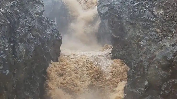Elazığ’ın Alacakaya ilçesinde sağanak yağış nedeni ile şelalenin coşma anı kameralara yansıdı.