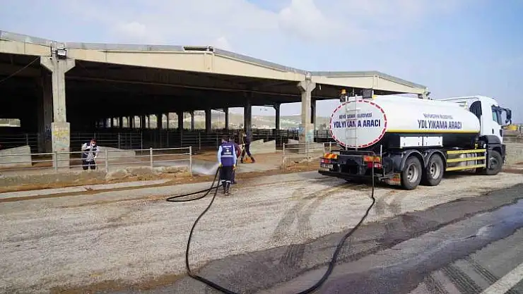 Diyarbakır Büyükşehir Belediyesi, şap olarak bilinen SAT-2 serotipi hastalığına karşı, Canlı Hayvan Borsası’nda dezenfekte çalışması yaptı.
