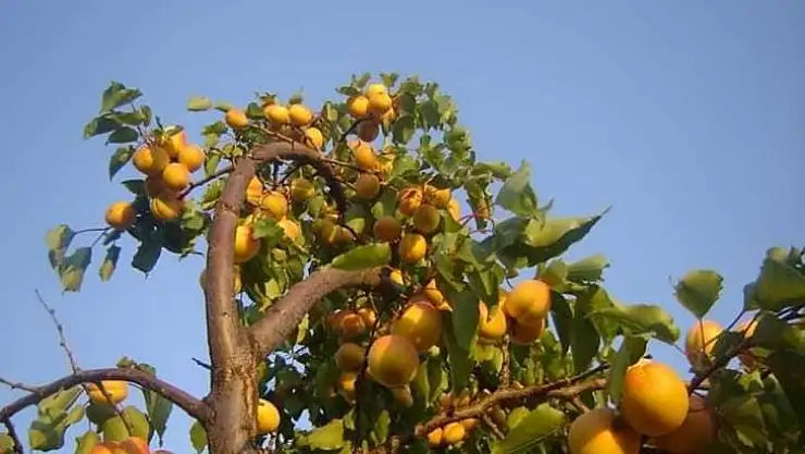 Yeşilyurt ilçesi Tecde Mahallesi Muhtarı Ali Yiğit, Tecde Mahallesi Altınkaşık mevkiinde tarım alanında kalan son bahçelerdeki kayısı ağaçlarında meyvelerinin olgunlaşmasıyla birlikte çok güzel kart postallık görüntüler ortaya çıktığını söyledi.