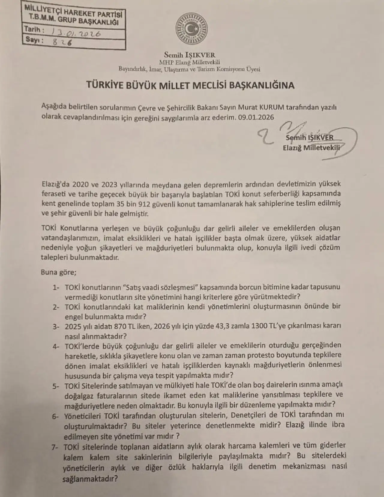 MHP Elazığ Milletvekili Semih Işıkver, Elazığ'daki TOKİ konutlarında teslimat sonrası ortaya çıkan fahiş aidat artışlarını ve inşaat kusurlarını Türkiye Büyük Millet Meclisi'ne taşıdı. Çevre, Şehircilik ve İklim Değişikliği Bakanı Murat Kurum'un yanıtlaması istemiyle sunulan önergede, dar gelirli vatandaşların yaşadığı mağduriyet vurgulandı.