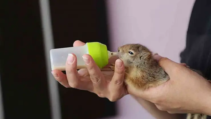 Tunceli’de anneleri araç çarpması sonucu ölen 2 yavru sincap biberonla besleniyor.
