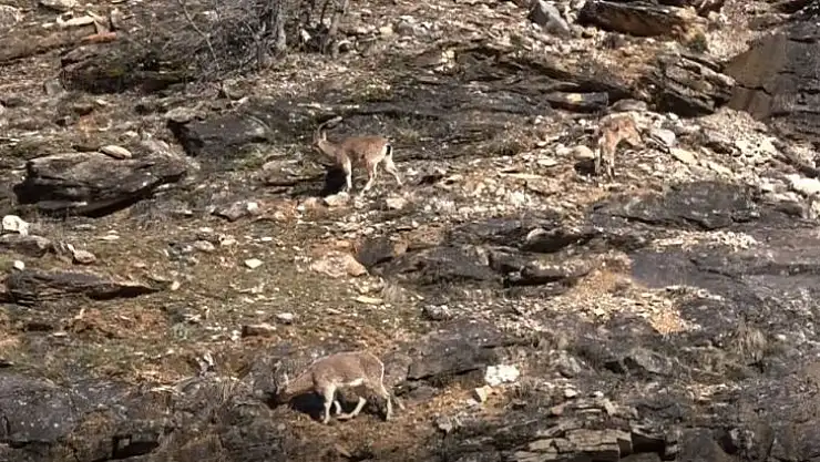 Munzur Vadisi Milli Parkı’nda koruma altında bulunan yaban keçileri karınlarını doyururken görüntülendi. Uzun süre görüntülenmelerine aldırış etmeden karınlarını doyuran yaban keçileri, daha sonra zirvelere doğru giderek gözden kayboldu.
