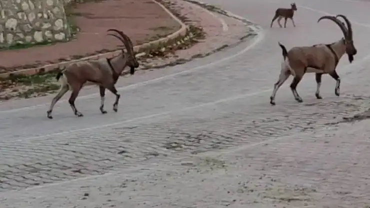 Nesli tehlike altında bulunan yaban keçileri, Tunceli'nin Çemişgezek ilçe merkezine kadar indi. Yılın bu ayları çiftleşme dönemi olan yaban keçilerinin sürü halinde dolaşmaları, cep telefonu kamerasına yansıdı.