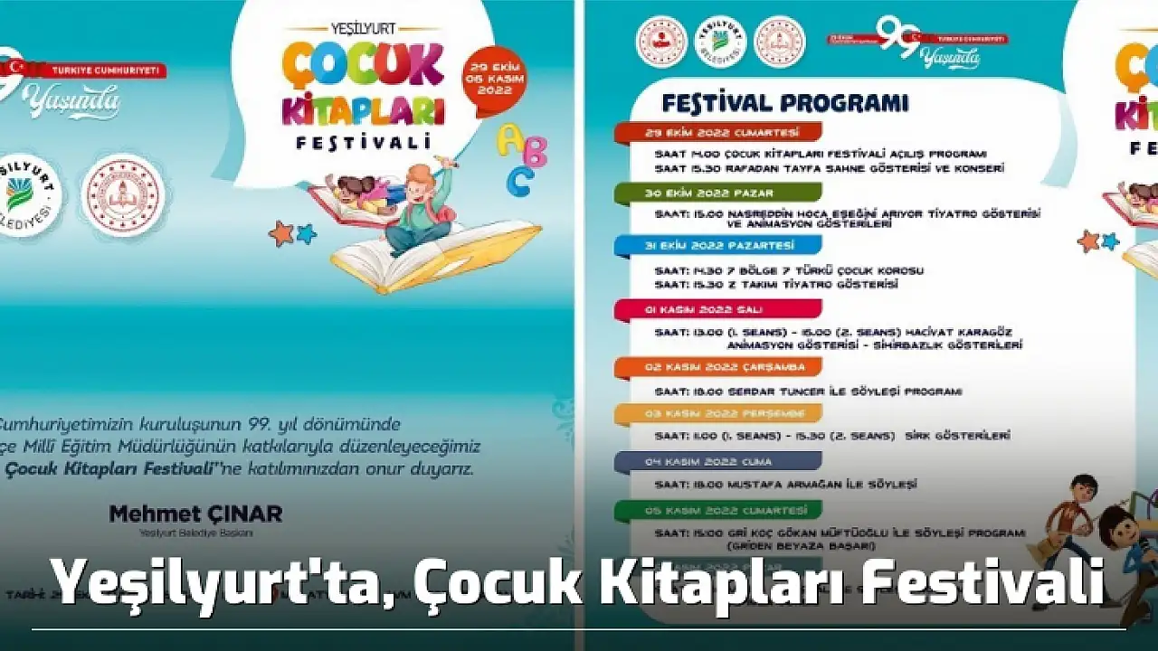 Malatya'nın Yeşilyurt Belediyesi, Türkiye Cumhuriyetinin 99.Kuruluş Yıldönümü etkinlikleri çerçevesinde, çocukları kitapla buluşturmak ve aynı zamanda çocuk kitapları konusunda çalışma yapan pek çok yazar, düşünür ve akademisyenle bir araya getirmek amacıyla 29 Ekim-6 Kasım tarihleri arasında 'Yeşilyurt Çocuk Kitapları' Festivaline ev sahipliği yapacak.
