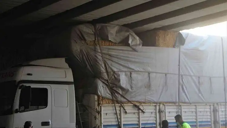 Yine aynı yer, saman yüklü tır alt geçide sıkıştı