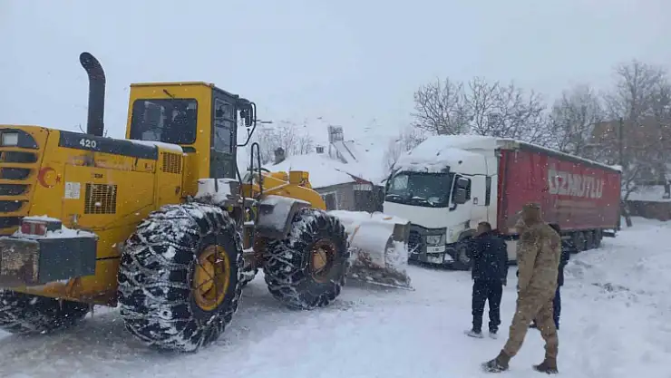 Elazığ'da kar yağışından dolayı yolda mahsur kalan tır, İl Özel İdaresi ve jandarma ekipleri tarafından kurtarıldı.