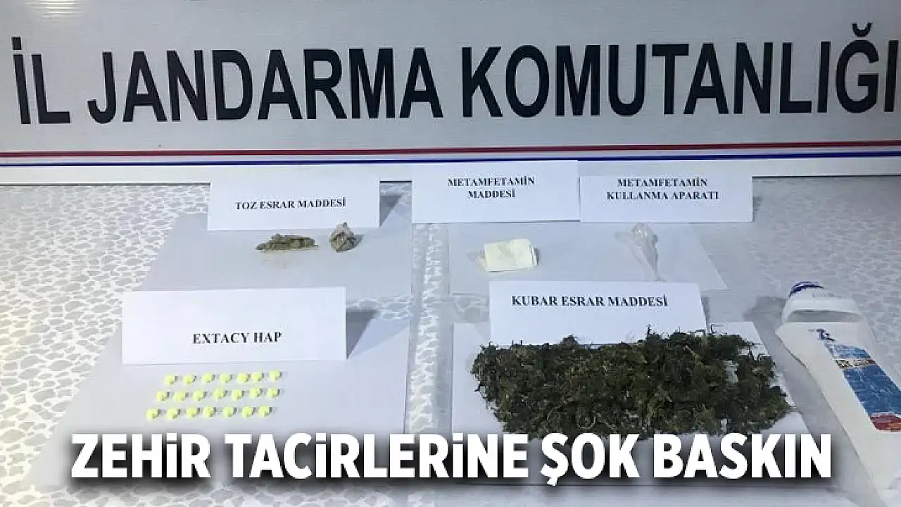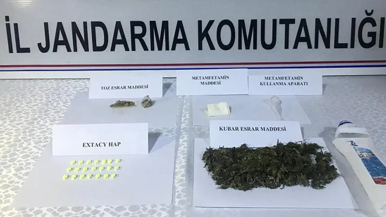 Jandarma ekiplerince yapılan aramada şüphelinin çantasında 500 gr toz, 68 gram kubar esrar ve 21 adet ecstasy hap 6 gram toz esrar maddesi ve 1 gram metamfetamin ele geçirildi.